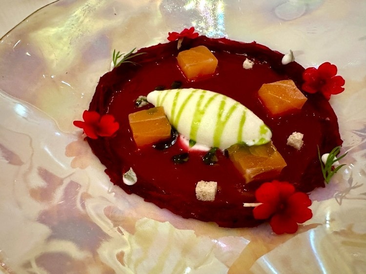 3皿目はビーツとディルのスープです。冷製スープにケフィア(発酵乳)、アイスクリーム、サーモンが入っていて、ちょっと北欧っぽいイメージです。