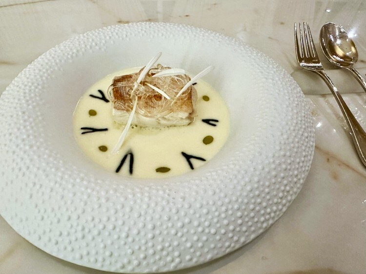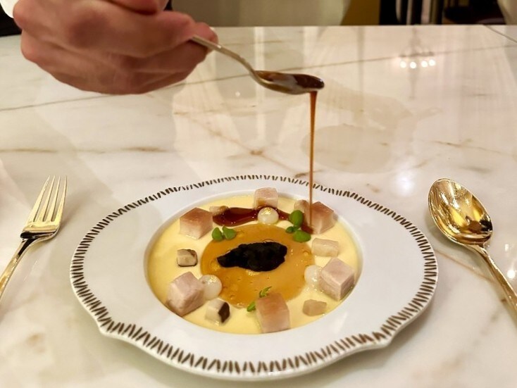 2皿目は海のプリンですね。トーストしたポークチョップやきのこなどの塩味のあるブリュレ。甘い料理に塩気のあるものを使うのもダコスタ氏の特徴のひとつです。滑らかで香ばしい。