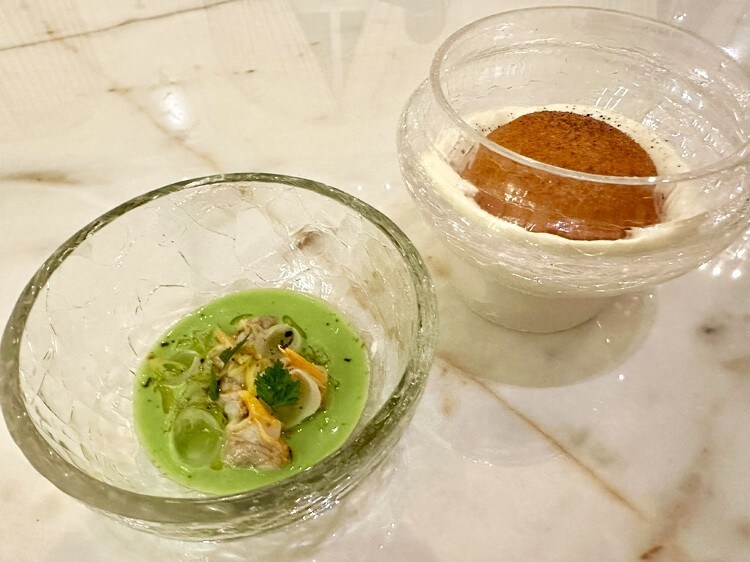 最初に出てきたのは、コックル(二枚貝)添のジルダと題されたもの。ジルダとは、バスク地方発祥のピンチョス(串刺しの軽食)のことで、青唐辛子、オリーブ、アンチョビに加えて小さな貝が一緒にささっているのが一般的なもの。それが海の香りの強いスープとして出されます。