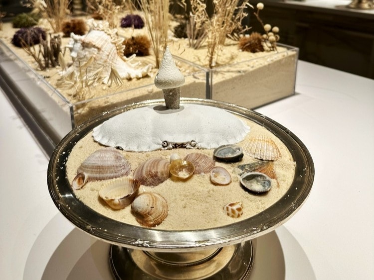 シャンパーニュは「ルイナール ブラン・ド・ブラン」。砂浜の石や貝を模した皿に乗せられたフィンガー・フードは海のエキスの詰まったアイス。そこからスタートです。