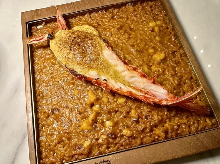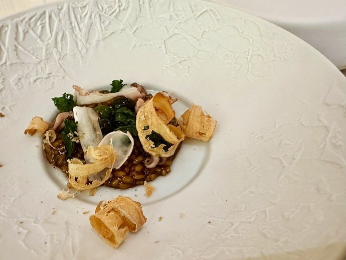 そして赤タコのリゾット。ダコスタ氏は米(アロス)料理の名人と言われた人で、これも彼の真骨頂の一つでしょう。出汁に干しダコの戻し汁が使われていますが、これはパエリアではなく、アロス・メロッソ(少し汁気のあるもの)で提供されます。海の記憶と発酵の香りにつつまれる深い味わいです。