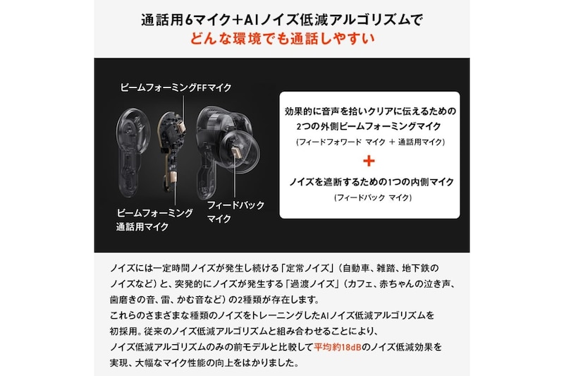 Amazonでみるハイブリッド構造のノイズキャンセリングにより、外音取り込みも自然で、外での会話やアナウンス確認もスムーズです。