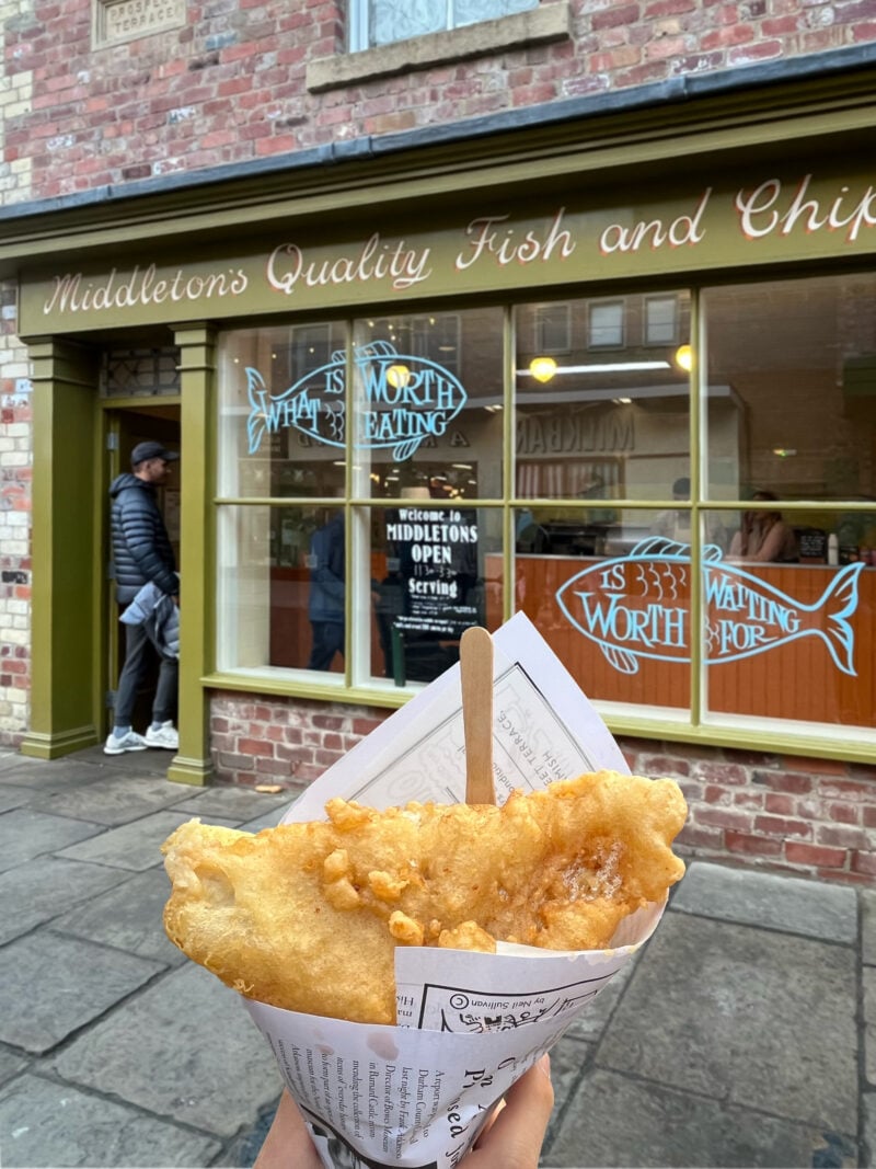 エリア内にあるフィッシュ&チップスのお店は家族連れや地元の人々で長蛇の列。これまでにもいろいろな街のフィッシュ&チップスをいただいてきましたが、どこも魚のフライは特大でフライドポテトも量が多い! 腹持ちがよく、休み時間のない労働者の1食として普及していったと知り、非常に納得です。画像は1950年の市街地エリアにあるフィッシュ&チップス店。こちらのものは小ぶりの切り身が乗った片手に持って食べられるサイズ。女性でも食べ切りやすいサイズでした(英国サイズとの比較なので、それでも十分大きいです)。