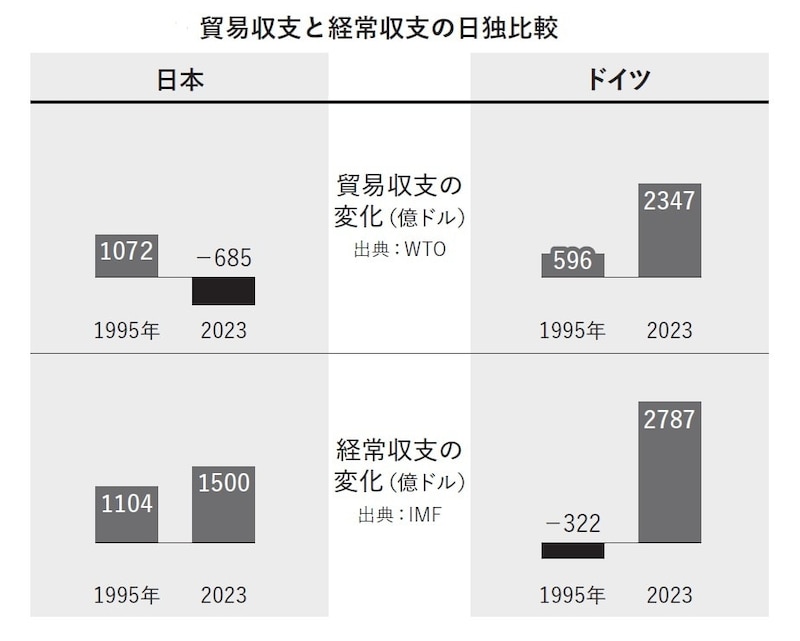 次に図表2の貿易収支(輸出輸入)と経常収支を見てみよう。ここに日本とドイツの産業構造・産業組織の違いが典型的に表れている。日本は、かつてものづくりの国ではあったが、じつはドイツほどに強力かつ大々的に輸出する力量はなかったのである。そのことを、かつてプラスだった日本の貿易収支が、大幅にマイナスになっていることが表している。逆に、ドイツは貿易収支のプラスを大幅に拡大させている。
