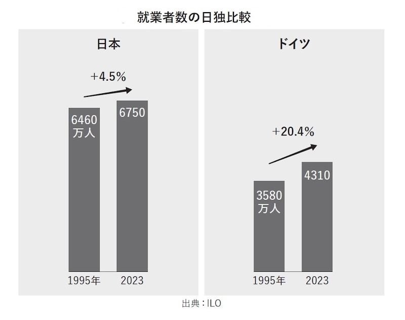 図表3が示すように、ドイツは就業者数も大きく増えている。28年間の伸び率で比べても、日本はプラス4.5%でドイツはプラス20.4%と大きく違う。ここにも、輸出によって得た付加価値が、国内において雇用を生み出している様子が見て取れる。