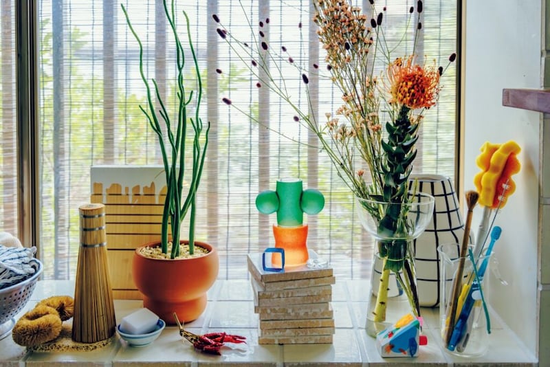 「扉のある収納がなく、食器や道具類のすき間にアートも置いているので、いろいろなものが目に入り、人によってはごちゃついているように見えるかもしれません。でも、それが私にとっては心地いいんです」