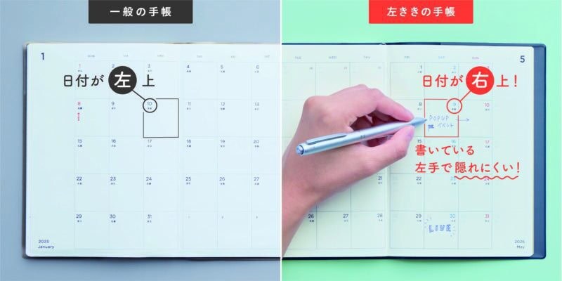 例えば日付。右きき用だと左上に書かれていることが多い日付を右上にすることで、書く手元で日付を隠してしまうことがありません。また、ウイークリースケジュールを右側に、メモページを左側に配置することで、スケジュールを見ながらメモを取ることが可能に。手帳の開きを右にすることで左手でページを探しやすくするなど、左ききにうれしい工夫が盛りだくさん! どのページも180度開く糸綴り製本で、巻末には便利な切り取りメモをつけるなど、使い手のことを考えた便利な仕様になっています。