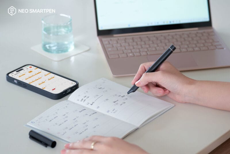ハイブリッドでスケジュール管理をしたい方は、手帳のほかにスマートペンも合わせてチェックを。このペンで手帳に書き込むことで、カレンダーアプリにスケジュールが連動(Neo smartpen dimoはカレンダー連動非対応モデル)。万が一手帳を忘れてしまっても、スマートフォンやタブレットさえあれば、いつでもどこでもスケジュールを確認できます。またこのスマートペンなら録音・再生もできるので、ミーティングや講義での記録や振り返りにも便利です(録音・再生はペンではなくお手持ちのスマートフォンやタブレット側になります)。