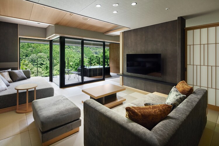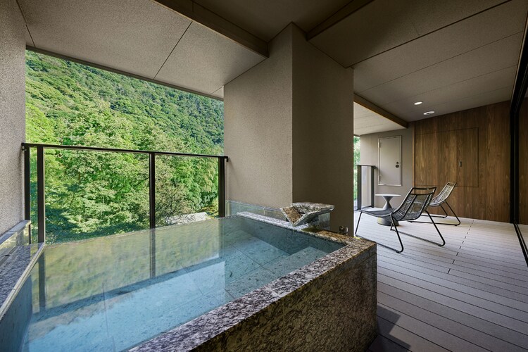 全室に露天風呂を完備し、その全てから湯坂山が眺められるので、プライベートな空間で人目を気にせず過ごすことができます。露天風呂の水面に山が映し出される様子も一興。湯船に浸かれば、目の前に湯坂山の多彩な木々と空だけが広がります。冬の凛とした空気と温かなお湯のコントラストが心地よく、耳を澄ますと須雲川のせせらぎや鳥のさえずりが聞こえてきます。日中、夕暮れ、夜、明け方と、移り行く時間を実に贅沢に感じることができるでしょう。