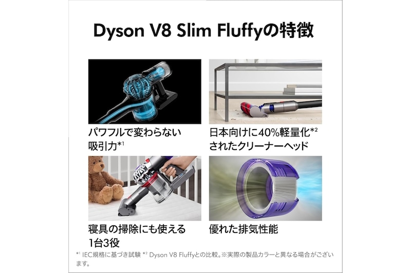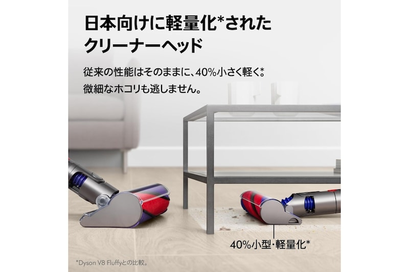 Dyson V8 Slim Fluffy Extra(SV10K EXT BU AM)は、コードレス掃除機の取り回しやすさはそのままに、本体をより軽く、よりコンパクトにしたモデルです。