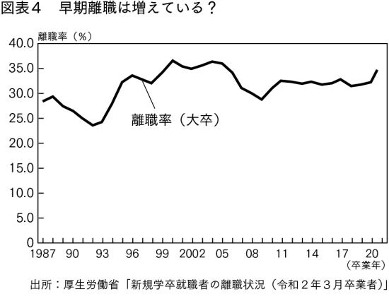 つまり『若者がすぐ辞める』という現象は最近に限ったことではなく、平成以降一貫して約3割前後が離職するというのが実態です。たしかに直近15年は32%前後で安定していたため34.9%は際立って見えますが、誤差といえる程度の変動といえます」