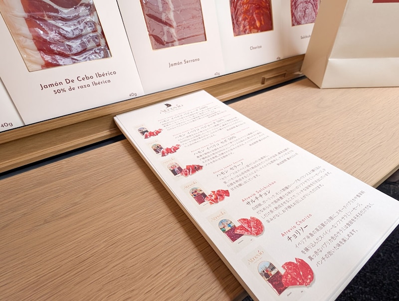さらに、フードメニューのほかには、ハモンやサラミなどのシャルキュトリーを量り売りで購入可能。スペインの情景を描いたオリジナルパッケージはギフトにもぴったりで、広尾らしい、ちょっと上質な手土産としても使えますよ。