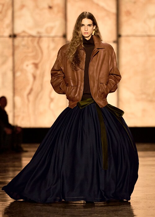 ロングドレスに合わせたビッグシルエットのレザーボンバーが今の気分。