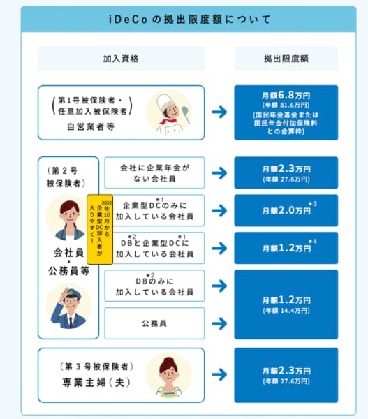 iDeCoの1カ月当たりの掛け金は5000円から1000円単位で設定でき、最大6万8000円までです。働き方によって積み立てできる限度額が異なります。
