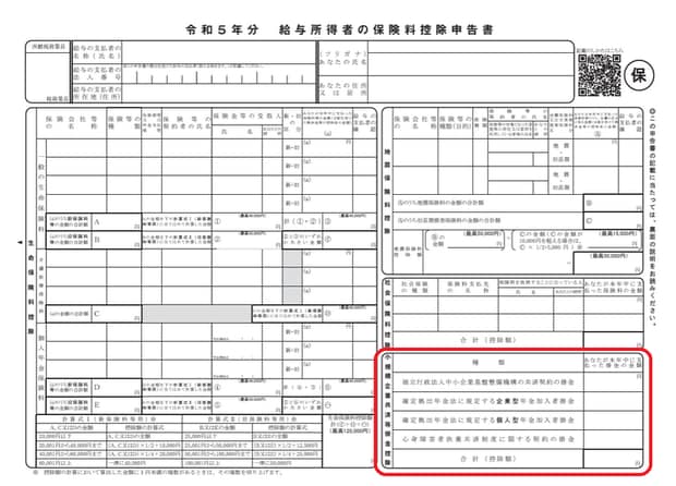 書類の右下部分に「小規模企業共済掛金控除」という枠があり、その中の「確定拠出年金法に規定する個人型年金加入者掛け金」のところに支払った掛け金1年分の金額を記入します。