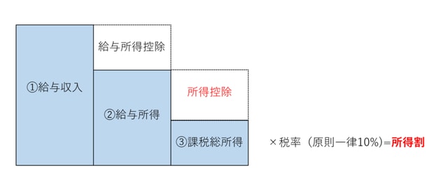 住民税における「所得割(所得割課税額)」は給与などの前年の所得から配偶者控除といった「所得控除」を差し引いた「課税所得」に10%を乗じた金額となります。