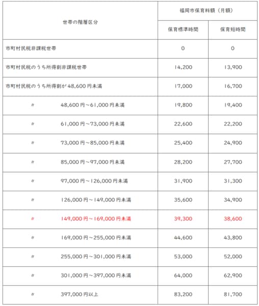保育料は以下表のように市町村民税(以下 住民税)の「所得割課税額(以下、所得割)」で決まります。この所得割は世帯ベースとなりますので、夫婦で共働きの場合はそれぞれの所得割を合算しなければなりません。以下、福岡市を例に紹介します。