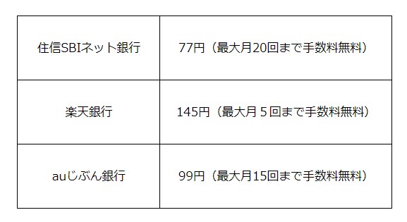 通常、他行宛の振込を銀行窓口で行うと600~900円程度の振込手数料がかかります。それと比べてネット銀行は、3行ともかなり低水準な手数料です。また所定の条件を満たすと月数回無料で振り込みを行うことができます。楽天銀行においては振り込む度に楽天ポイントがもらえるサービスもあります。