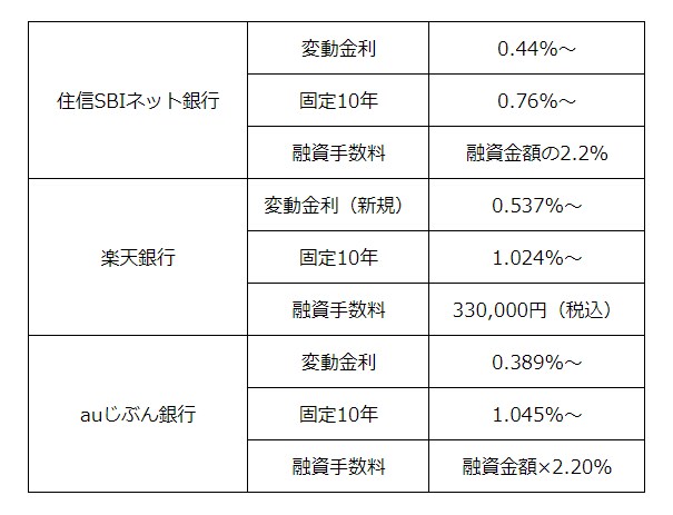 住宅ローンの新規借入時の金利(変動金利と当初10年間固定金利)は3行ともそれほど大きな差はありません。以前は店舗型の銀行と比べると金利の低さが際立っていましたが、現在はメガバンク、地方銀行いずれも大幅な金利引き下げを実施しており、ネットと実店舗での金利差もそれほど大きくないという印象です。
