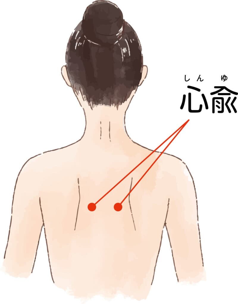 肩甲骨の下から3分の1の高さで、背骨と左右の肩甲骨の中間点にあるツボ。心臓の近くにあり、血液循環を整えて心血を補い、不眠、情緒不安定、怒りっぽいなどの精神状態をやわらげます。記憶力や集中力の低下が気になるときにもいいでしょう。自分の手で直接押すのは難しいので、背中用のツボ押し棒でさするように押すか、うつ伏せになってホットタオルを乗せてツボ周辺をほぐすといいでしょう。