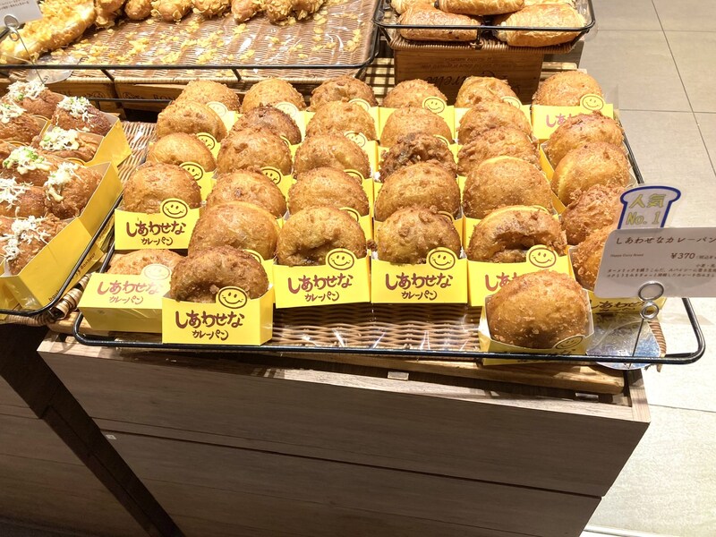 「しあわせなカレーパン」です。日比谷店での売り上げは、一日に100~120,130ある大人気商品です。肉に加えて大きめのジャガイモがゴロゴロと入っていて、生地にもカレー粉が練り込まれています。ピリ辛のカレーで、幅広い方に召し上がっていただけます。