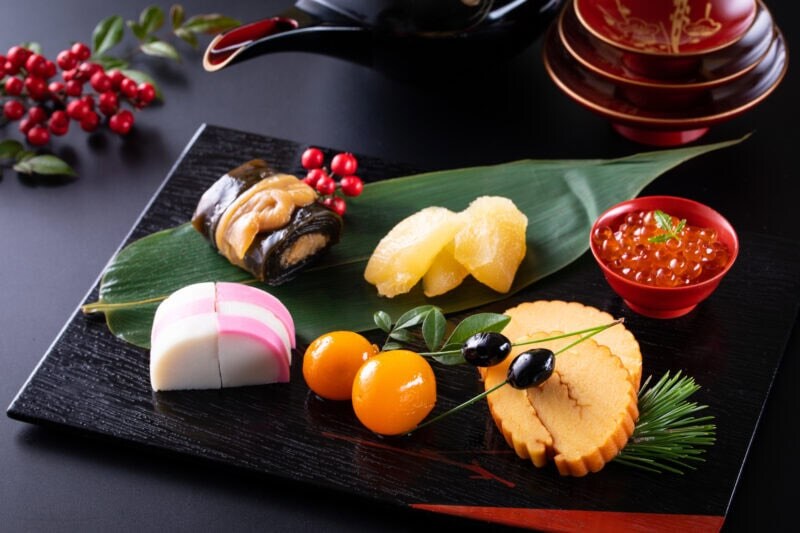 おせちには青・赤・黄・白・黒の五色が用いられていて、葉もののあしらいや若桃の甘露煮などの青は「肝」、えびやにんじんなどの赤は「心」、栗きんとんや伊達巻きなどの黄は「脾」、里芋やれんこんなどの白は「肺」、黒豆や昆布などの黒は「腎」の健康を願ったものとされています。おせちを食べるときは、この五色の彩りを楽しみながら五臓の健康を願うといいかもしれません。
