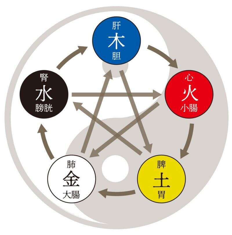 五行とは、自然界のあらゆる物質や現象を木(もく)・火(か)・土(ど)・金(きん)・水(すい)の5つにひもづけて分類する考え方のこと。色を木・火・土・金・水にひもづけたものを五色、人体の臓をひもづけたものを五臓といい、その関係性は以下のようになっています。