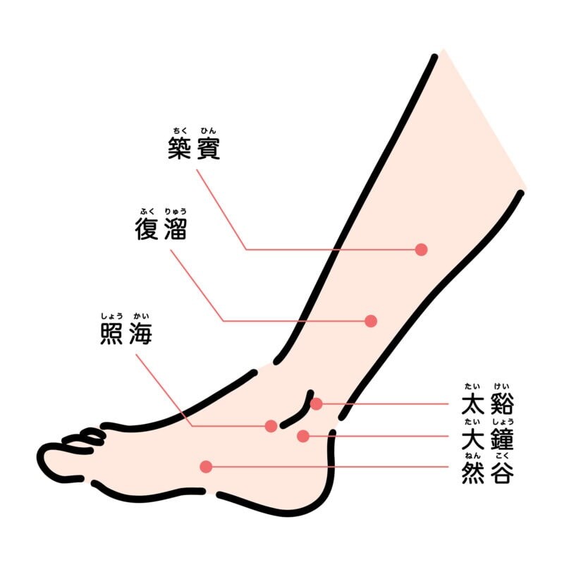 復溜(ふくりゅう)のツボ押しもおすすめです。復溜は内くるぶしの中心から指3本分上、アキレス腱のきわにあるツボで、水分代謝を整えてほてりや熱感を鎮めることが期待できます。指先でやさしく数回押してください。