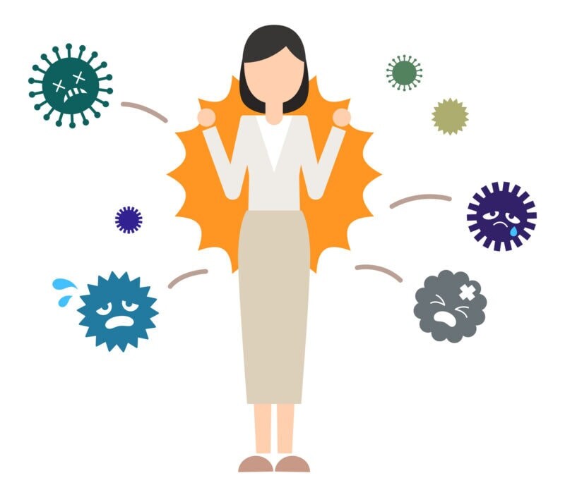 東洋医学では、花粉やウイルスなどの有害物質が体内に侵入するのを防ぐ体表面のバリア機能を「衛気(えき)」と呼びます。これは、体の生命エネルギーである「気(き)」の一種で、皮膚や粘膜などの体表面を速いスピードで流れている活動性の高い気のこと。その働きは次のようなものになります。