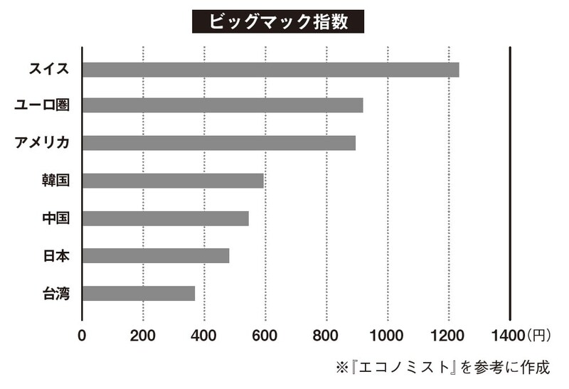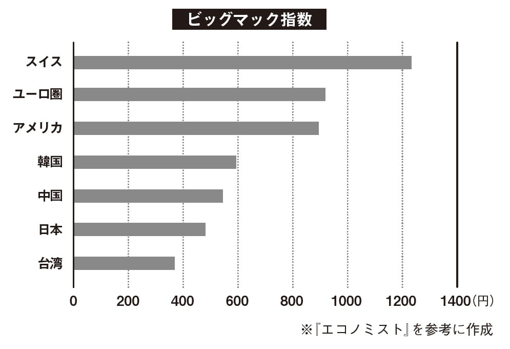 同じようなメニューでも、国によってこれほどまでに値段が違うのには驚きですよね。これを示したのが「ビッグマック指数」です。