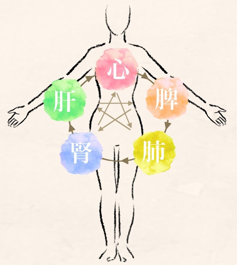 同じように人間も、春は体の奥深くに蓄えていたエネルギーが上昇・発散しはじめ、梅雨時は体内に水分をたっぷり蓄えてめぐらし、夏はさかんにエネルギーを燃焼し、秋はエネルギーを内向きに収縮させ、冬は体の奥に生命力を蓄えて春に備えるという変化を繰り返しています。春の上向きの発散力が肝の働き、梅雨時に体内の水分を全身に運ぶ力が脾の働き、夏のエネルギーを燃焼する力が心の働き、秋のエネルギーを内向きに収縮させる力が肺の働き、冬の生命力を蓄える力が腎の働きにあたります。