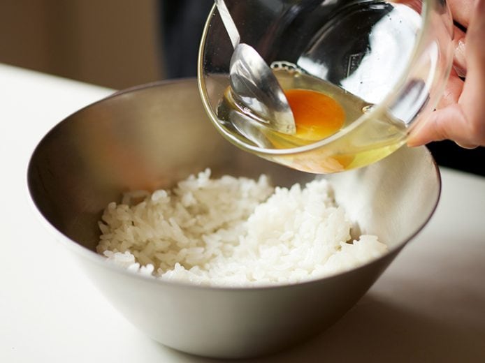 3.ボールに卵を入れ白身の半量を1に加えて混ぜ合わせ、ごはん全体をコーティングする。残りの卵は溶きほぐす