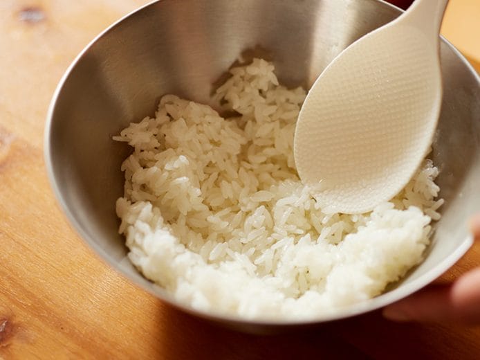 1.ご飯を少し冷ます:次に混ぜる卵の白身が固まらないように。