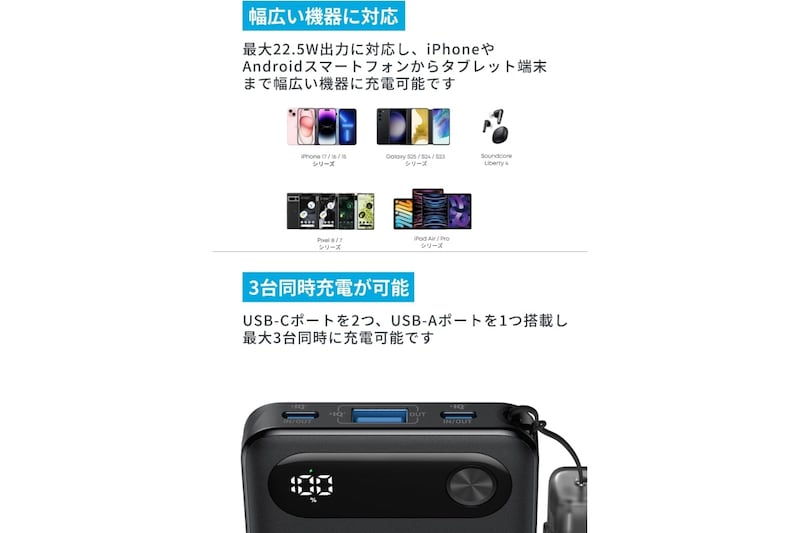 Ankerの容量10000mAhモバイルバッテリーは、最大22.5W出力に対応したスリムなモデルです。