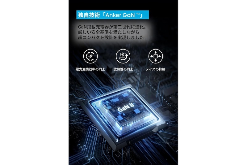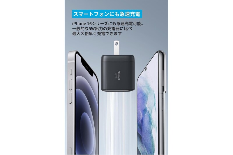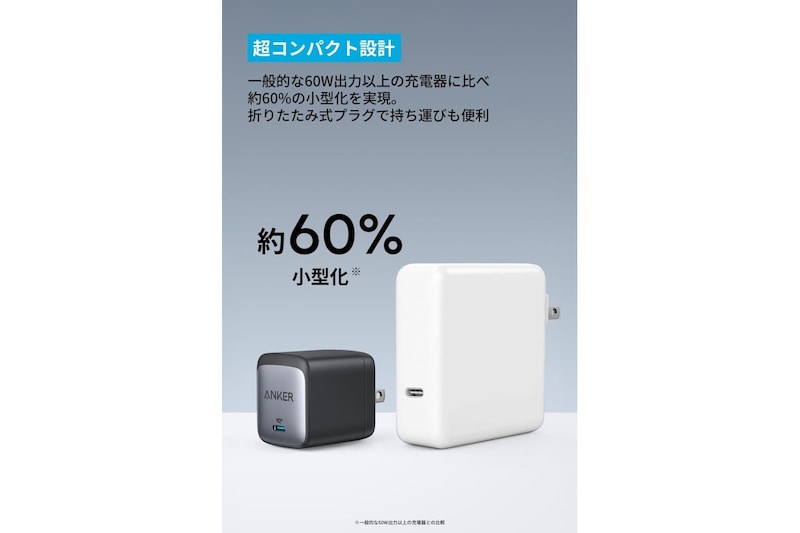 AmazonでみるGaN(窒化ガリウム)採用の充電器は、同じ出力でも本体を小さくしやすいのがメリットで、このモデルもサイズ感がコンパクト寄り。