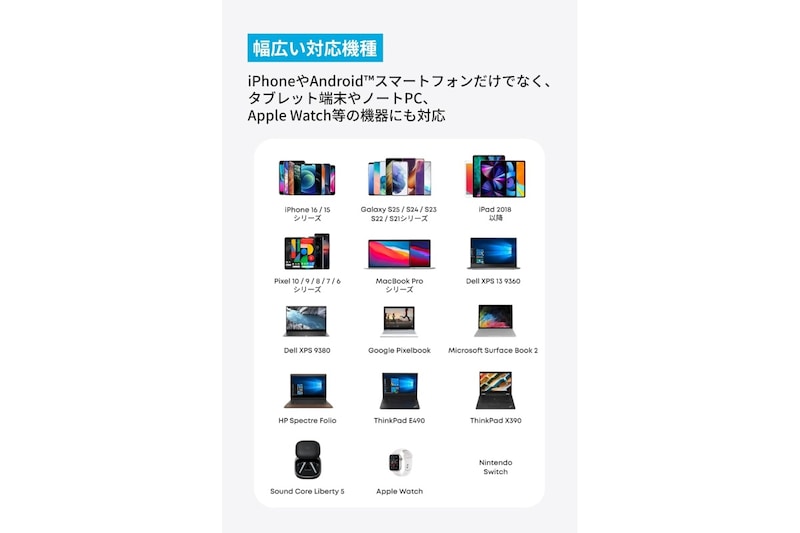 対応機器はPD対応のノートPC、iPad、iPhone、Androidスマホなど幅広め。