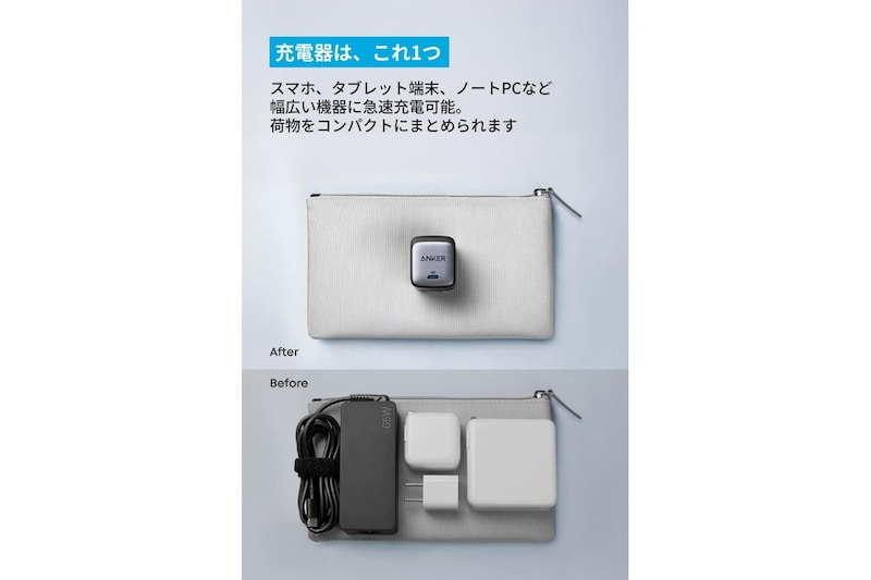 Amazonでみるスマホ用の小さい充電器だとPCは充電できなかったり、充電が追いつかなかったりしますが、これは1個でPC~スマホまでまとめやすいタイプです。