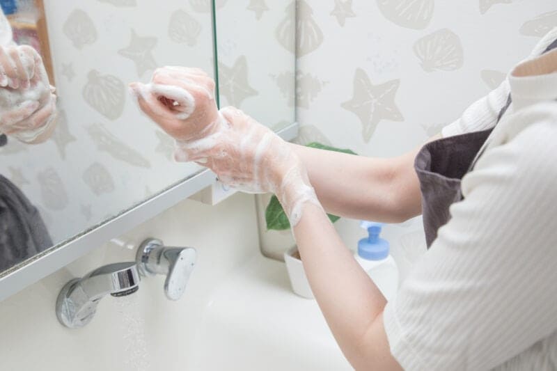帰宅時や料理をする時、食事前などにこまめな手洗いをしましょう。指先や爪の間、指の間、手首もしっかり洗うのがポイント。また、アルコール手指消毒剤による手指の消毒も効果的です。