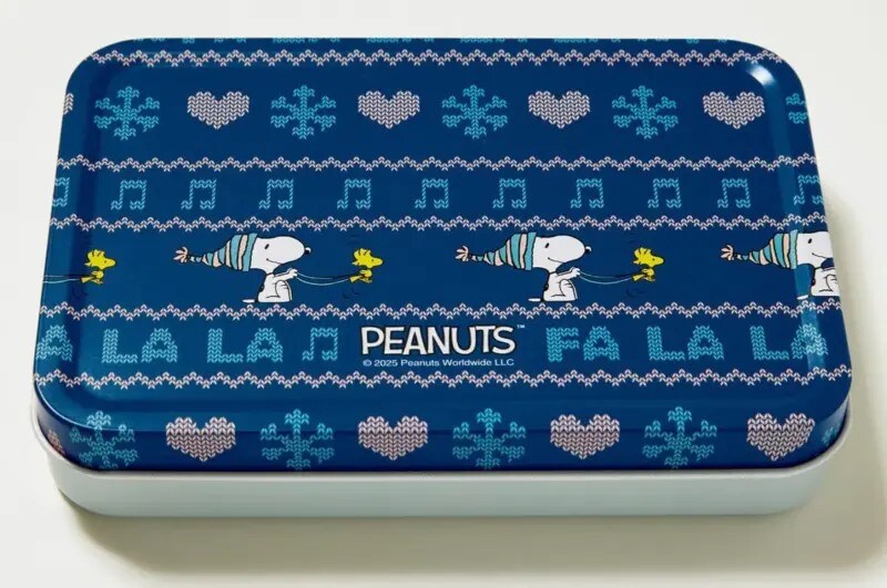 編み込みニット風のプリントと、スヌーピー&ウッドストックのイラストがマッチしたおしゃれなブリキ缶。