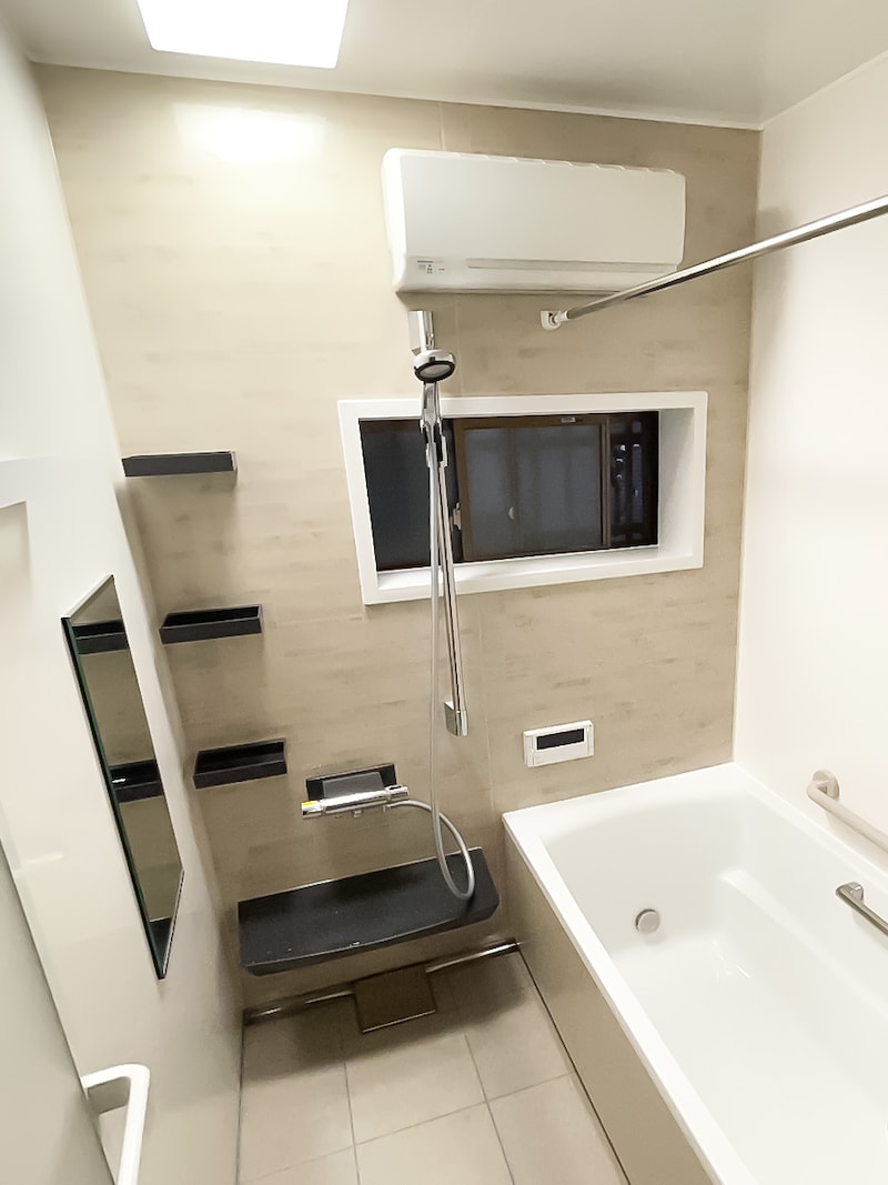 浴室の広さを確保するためにオーダーサイズを選び、浴室の各所には、くぼみのあって握りやすい手すり(ディンプルタイプ)を採用。