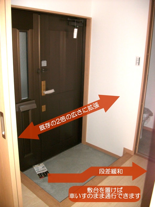段差を緩和したので、敷台を置けば車いすのまま室内へと入れます。
