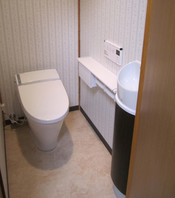 リフォーム時には段差を解消しフラットにし、バリアフリーに。便器にはお手入れがしやすいタンクレストイレを選んだので、掃除の頻度を減らせます。