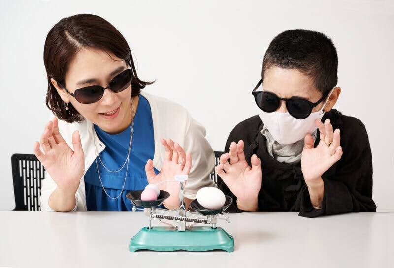 まずは天秤にラブパール・ライトと卵をのせて、どちらが重いかを実験。一般的な卵一個の重さは60~70g程度。対してラブパール・ライトの重さは 42g。「卵の方が下がったということは、やはりライトの方が軽いのですね!」(編集・M)