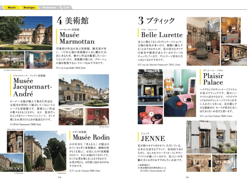書籍の中にはカフェやレストラン、ブティックなど、石井さん行きつけのスポットも紹介。パリを訪れる際の観光案内としても役立ちます。