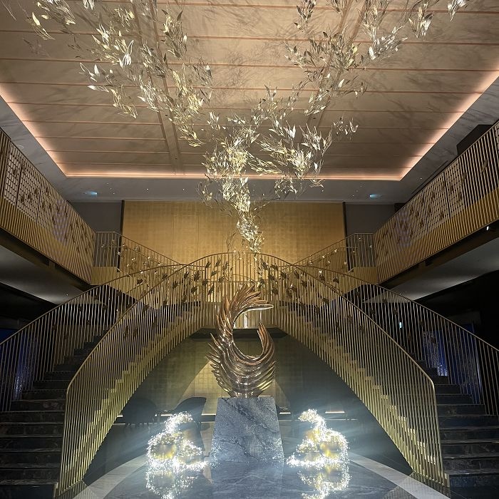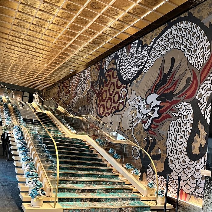 扉が開き、ホテルエントランスの先に広がるのは、息をのむほど豪華な異空間です。美術価値のある壺(つぼ)が並ぶ黄金色の廊下、その奥にある黄金色の階段の左右には、唐紙をアートにした第一人者、千田長右衛門氏による屏風(びょうぶ)や、黄金色にきらめきながら天に昇る鳳凰(ほうおう)を模したオブジェなど、麟鳳亀龍(りんぽうきりゅう)をはじめとする吉祥の象徴が飛び交う夢のような情景です。
