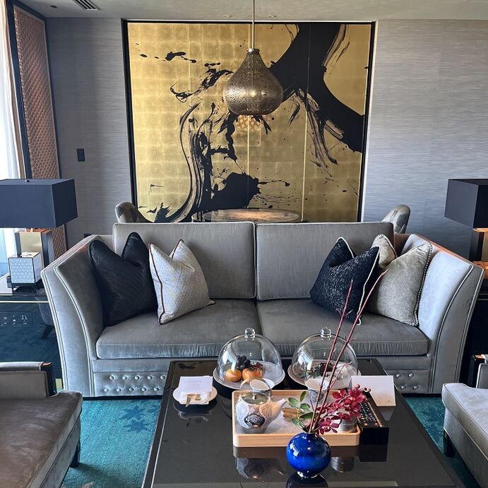 壁に掲げられた日本画はもちろんのこと、ソファやクッション、ルームバー、ドレッサーといった調度品すべてに徹底した世界観を貫いているのがさすがです。