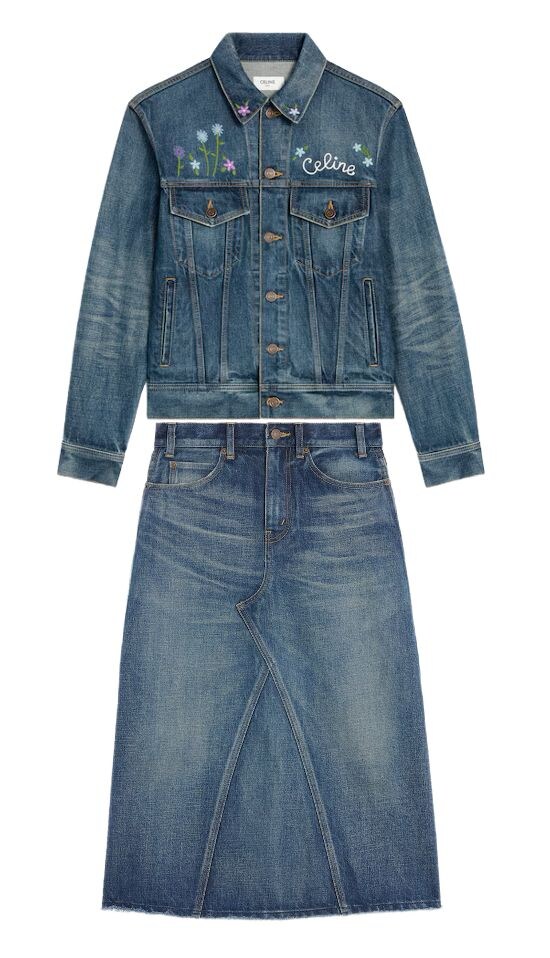 ほどよいウォッシュ加工で、こなれ感のあるデニムスタイルが完成するセリーヌのセットアップ。ジャケットもスカートも、クラシックなテイストだが、ロマンティックなフラワーモチーフのアクセントが楽しい。ジャケットの背面のウエスト部分には、トリオンフ刺繍(ししゅう)も。