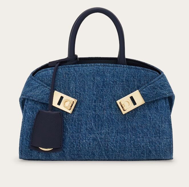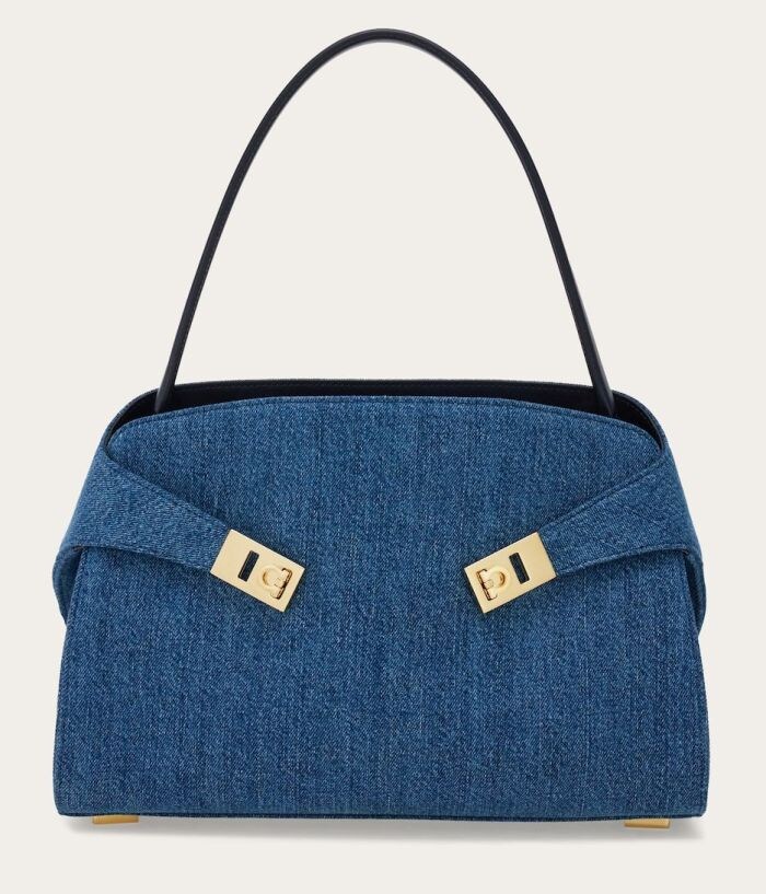 同じデザインでも、レザー素材とは異なる魅力を放つデニム素材。ガンチーニ・クロージャーとサイドストラップにより生み出される丸みを帯びたシルエットが印象的なフェラガモのHUGバッグも、軽快な印象になり、カジュアルシーンにも映える佇まいに。