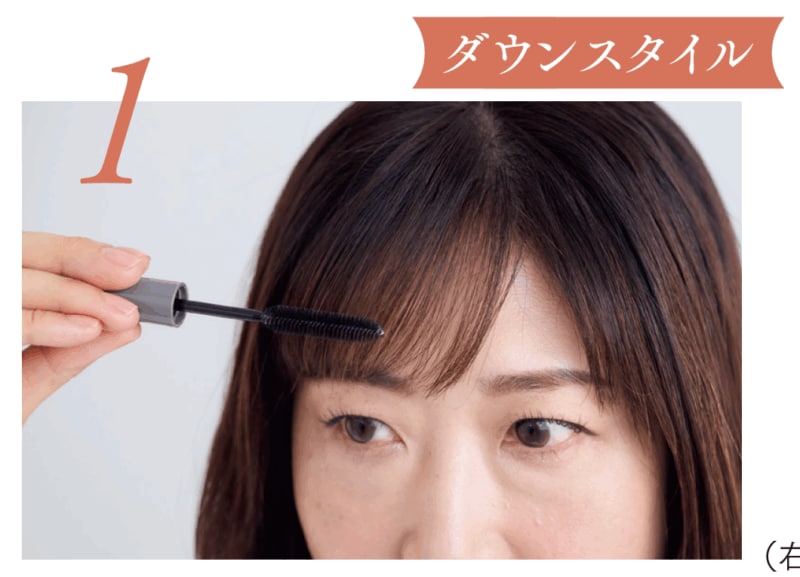 ピンを外して表面の髪をおろし、同じように表面の髪をヘアマスカラでなでながら整える。