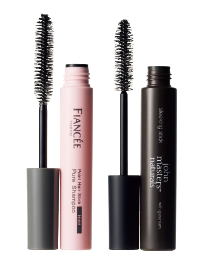 表面の髪を軽くピンでとめ、内側の髪を根元からヘアマスカラでなでる。